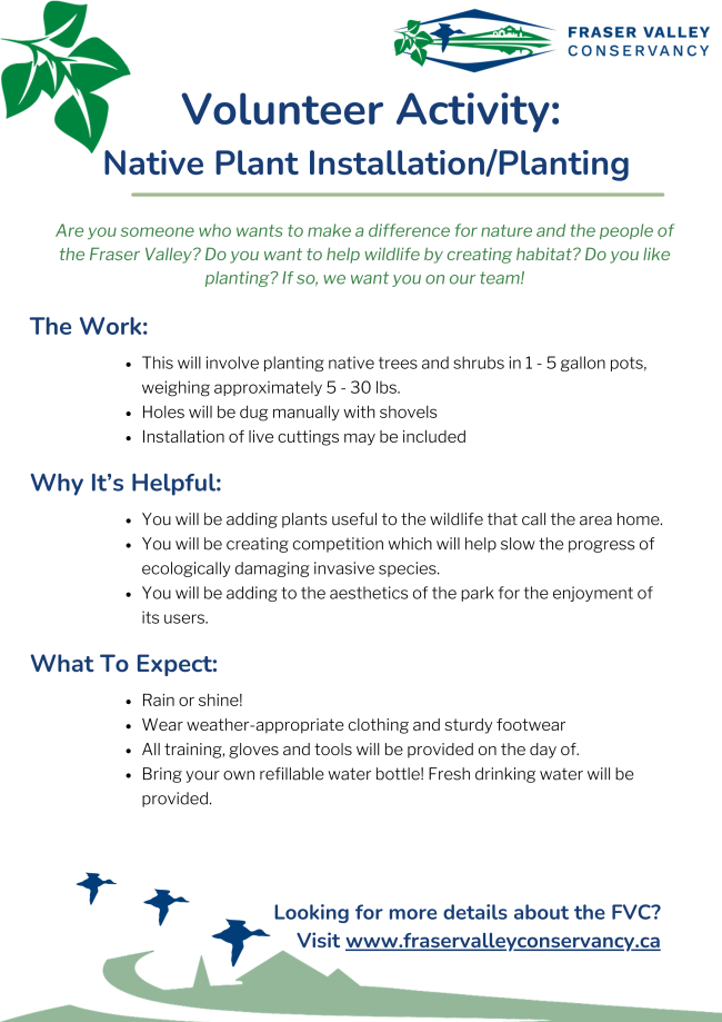 Are you someone who wants to make a difference for nature and the people of the Fraser Valley? Do you want to help wildlife living in urban environments? Do you like planting? If so, we want you on our team!