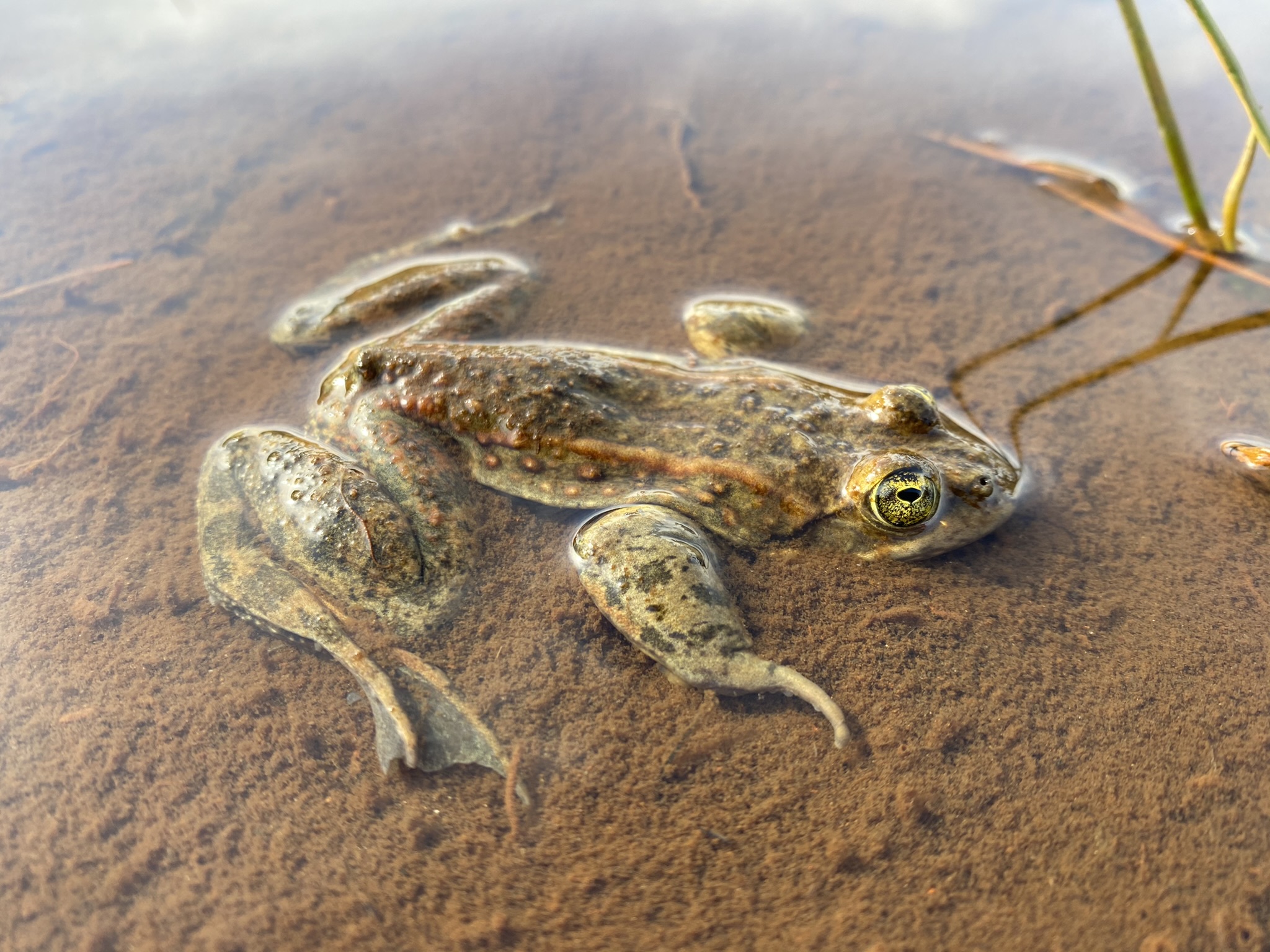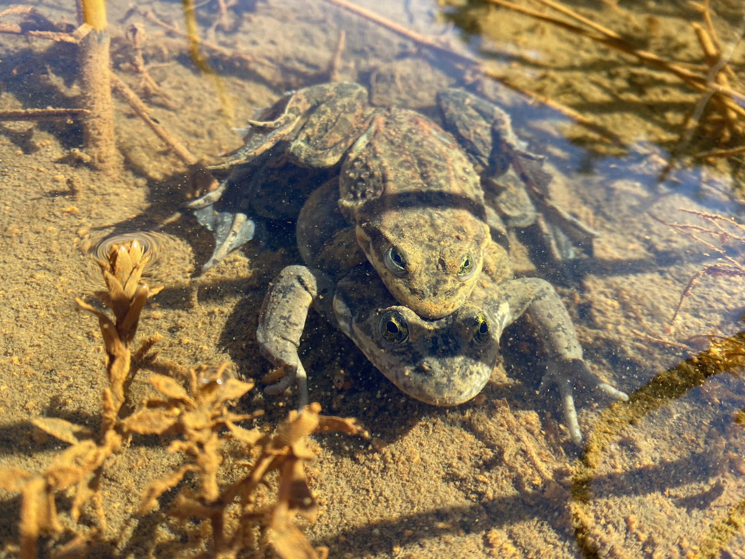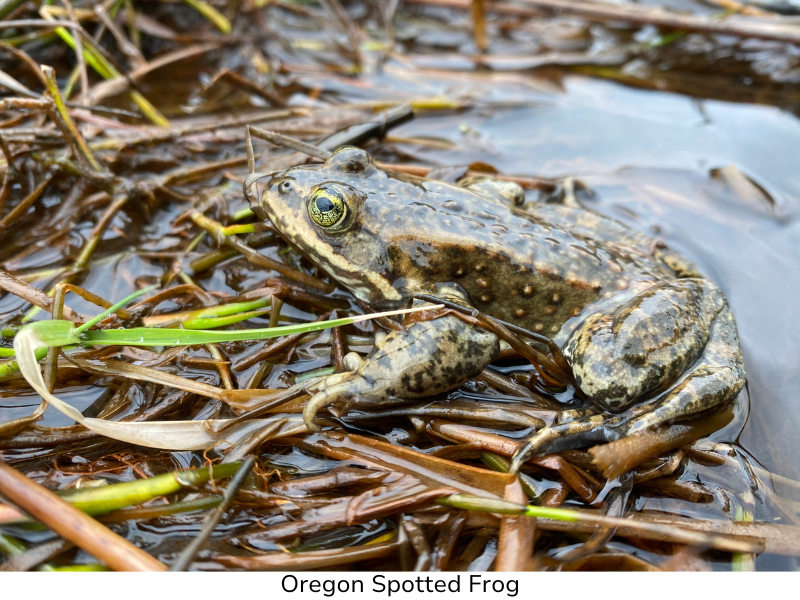 Occupying warm, shallow wetlands with plenty of aquatic and emergent vegetation, these frogs are masters of camouflage. They are also highly aquatic, rarely leaving the water unless they need to move locations. Because of this it is important for them to have access to different kinds of aquatic habitat for the seasons. Shallow shelves are essential in the spring for breeding, warm, open channels in the summer and fall for foraging, and deeper water with plenty of cover in the winter for hibernation. These are all examples of essential habitat that must exist within a wetland for Oregon Spotted Frogs to survive there.