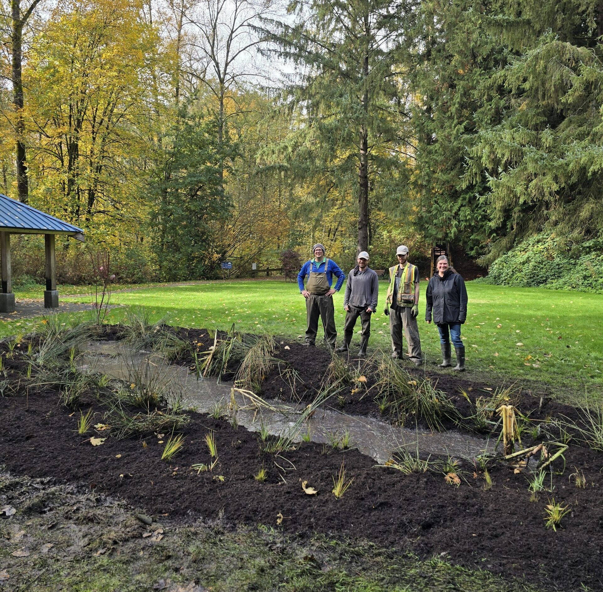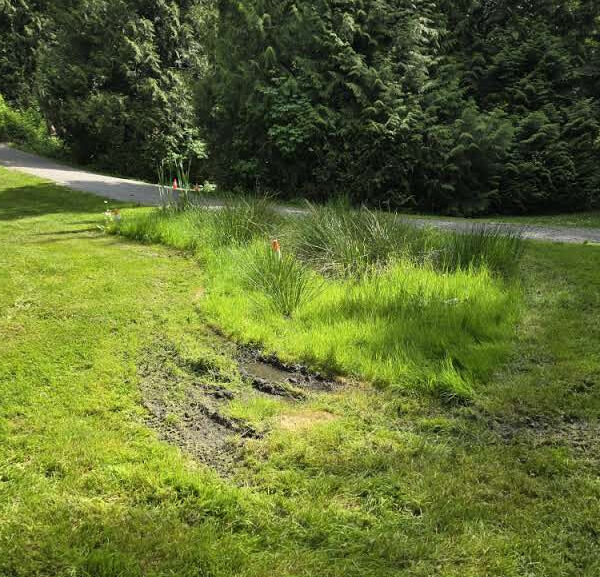 The scene is a wet spot where trucks keep getting stuck in Williams Park, Langley. The solution is one that could only come from a habitat enhancement coordinator like Jon Blais, who is one of the very few people who would look at a puddle behind some cones and think, this will make a great wetland garden. Based on the types of vegetation already growing there, Jon had no doubt about this particular spot’s wetland aspirations.